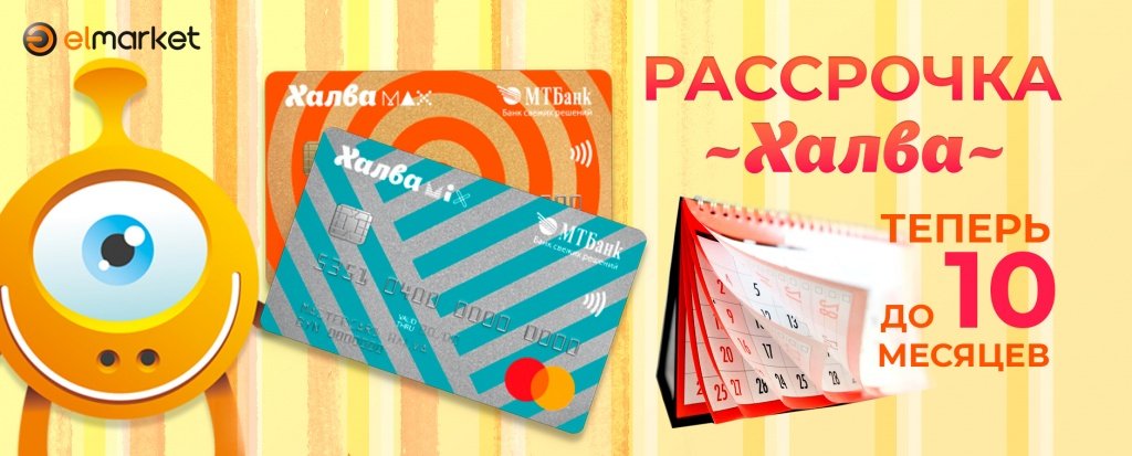 Вы можете планировать свой бюджет при совершении покупки в elmarket.by, выбирая удобный для себя срок рассрочки: 2, 6 или 10 месяцев. Теперь совершать покупки в elmarket.by стало еще выгоднее!